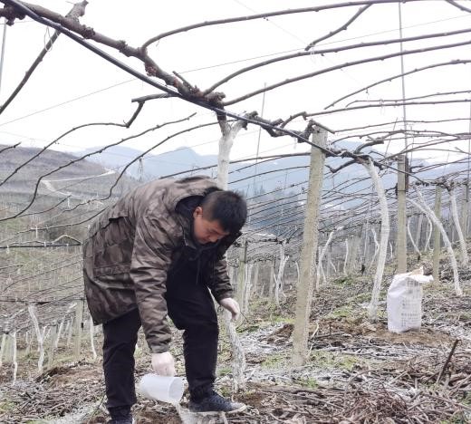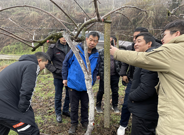 1月19日,龙友华老师带领博士村长猕猴桃科技服务队成员利用专业优势,前往贵阳市息烽县石硐镇中康公司猕猴桃产业园,进行田间试验。2月19日,年初低温天气的出现给猕猴桃春季病虫害防控带来了巨大阻碍,贵州省内多地出现低温降雪,顶着风雪,冒着严寒,他们又前往长期合作的中康公司,深入田间,认真仔细地指导中康公司工作人员如何应对低温天气对猕猴桃的影响。2月27日,天气开始回暖,他们又前往贵阳市修文县谷堡镇进行猕猴桃绑枝工作的指导,悉心指导工人如何进行绑枝,遵循“一枝两蔓”原则进行绑枝,将猕猴桃枝条在行间绑成“排骨状”,有利于猕猴桃的生长发育及挂果,同时进行猕猴桃枝条剪口的保护工作。