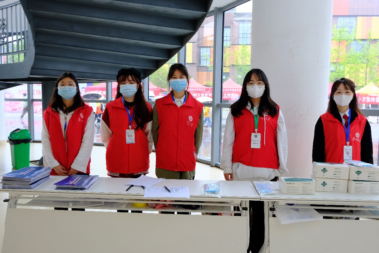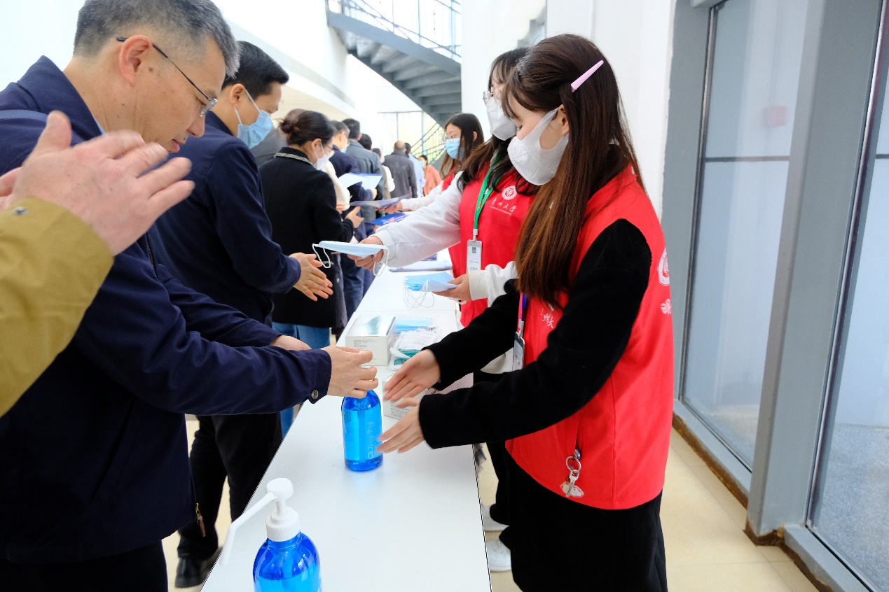 志愿者们穿戴好红马甲提前到岗就位,各自分工、井然有序地开展志愿工作,主要负责现场物资的搬运、入场签到消毒、活动现场场控和引导等。