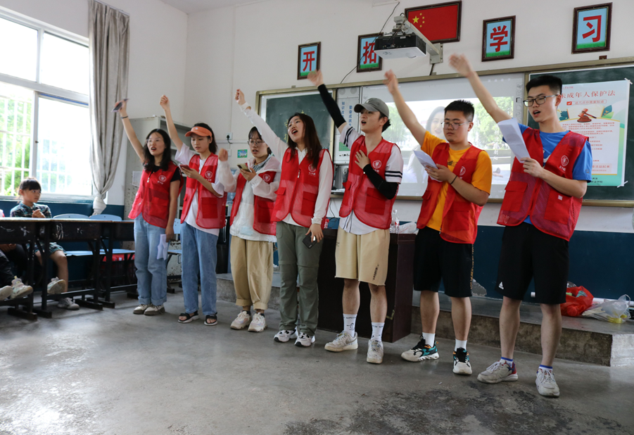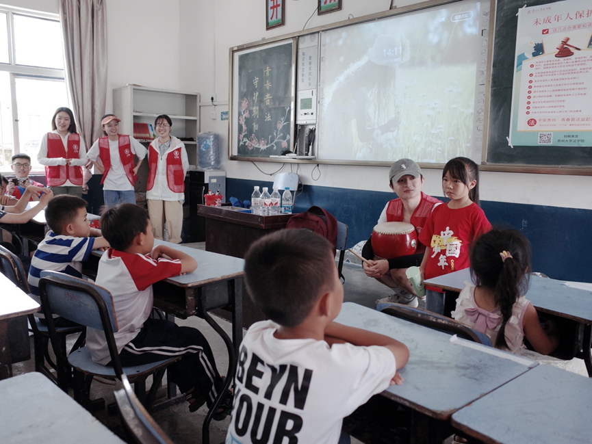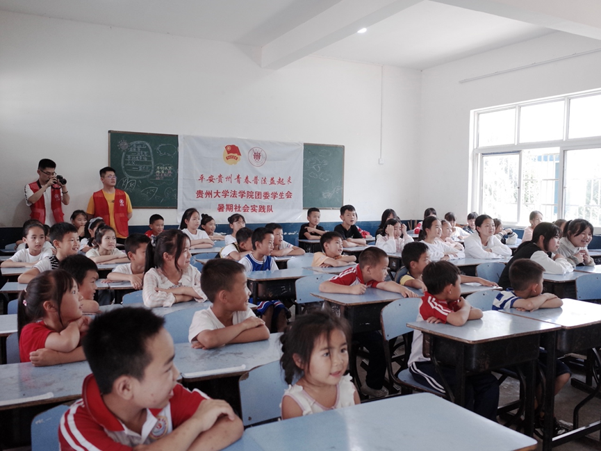 团委网站讯 7月15日,我校法学院“三下乡”暑期社会实践队走进黔东南苗族侗族自治州丹寨县兴仁镇烧茶小学,开展“平安贵州,青春普法益起来”法治宣传活动,50余名当地小学生参与活动。