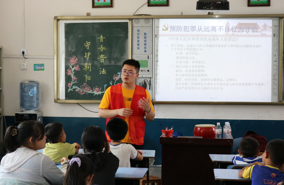 实践队队员李志远利用动漫、视频、ppt等,通俗易懂地向小朋友们讲述《民法典》《未成年人保护法》以及《预防未成年人犯罪法》等相关知识。并采用积分赢奖品的形式,鼓励小朋友在提问环节踊跃发言,引导当地青少年强化法律意识,增强法治观念。
