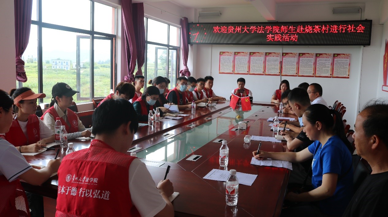 团委网站讯 7月14日下午,我校法学院“三下乡”暑期社会实践队抵达贵州省黔东南苗族侗族自治州丹寨县兴仁镇烧茶村,并召开工作对接座谈会。丹寨县团委副书记曾思宇、兴仁镇党委副书记姚茂杰、烧茶村党支部书记杨秀贤、驻村第一书记杨光磊、烧茶小学老师代表及社会实践队全体成员参加座谈会,会议由姚茂杰主持。
