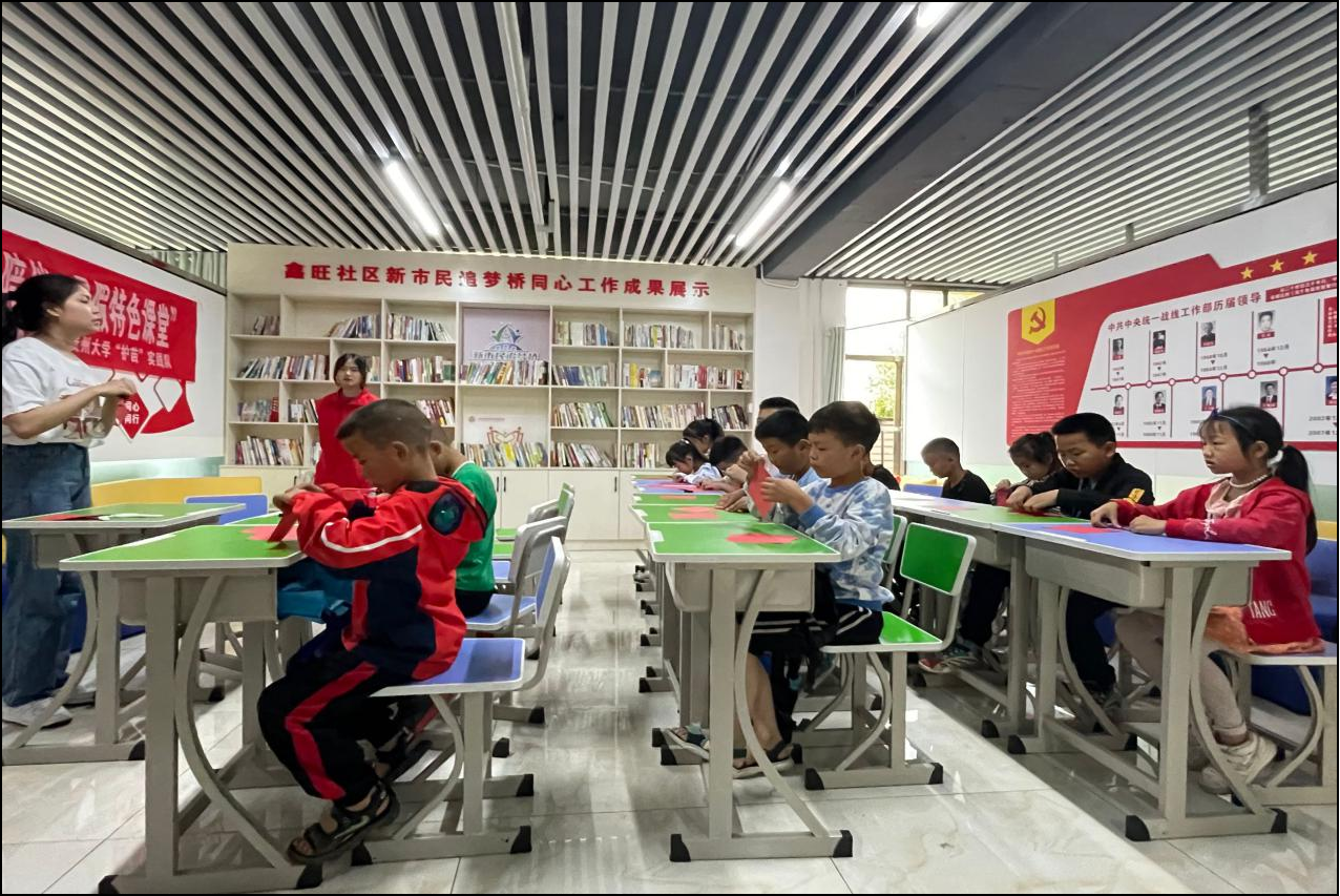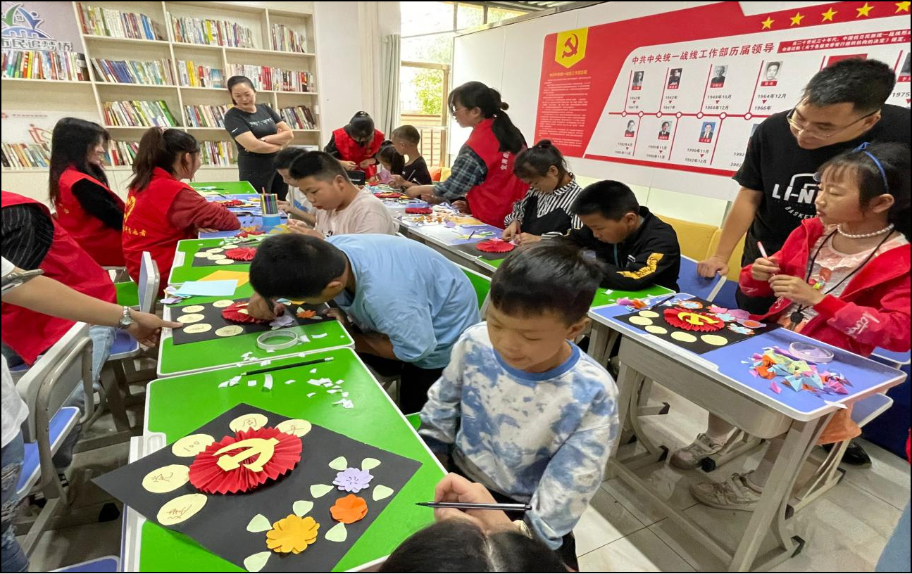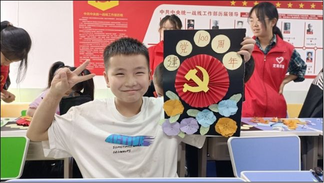 对小朋友的心理健康教育中,自信心树立占基础地位。一个缺乏自信心的人,便缺乏各种能力发展的主动积极性,很难体会到成功的喜悦,成长起来就很慢。因此,志愿者们邀请蓝图画室的老师教小朋友们做创意手工。儿童创意手工能迎合相应年龄阶段孩子的心理生理特点,同时也和绘画一样又能极大地培养孩子们的审美情趣和综合能力,从而进一步激发孩子的创作欲望。在老师们的帮助下,小朋友们做出了极具童趣的手工制品,让他们能从每一个手工作品中收获体验感和成就感。不仅如此,老师与小朋友们共同制作了庆祝建党一百年的贺卡,介绍了中国共产党百年奋斗的艰辛历程和伟大成就,播种下了小朋友们的爱国意